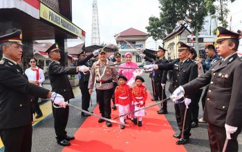 Setelah acara pisah sambut, Kapolres Padangsidimpuan AKBP Wira Prayatna dan pejabat utama serta para Kapolsek dan personel dengan berurai air mata mengantarkan AKBP Dudung dan istri dengan prosesi pedang pora.