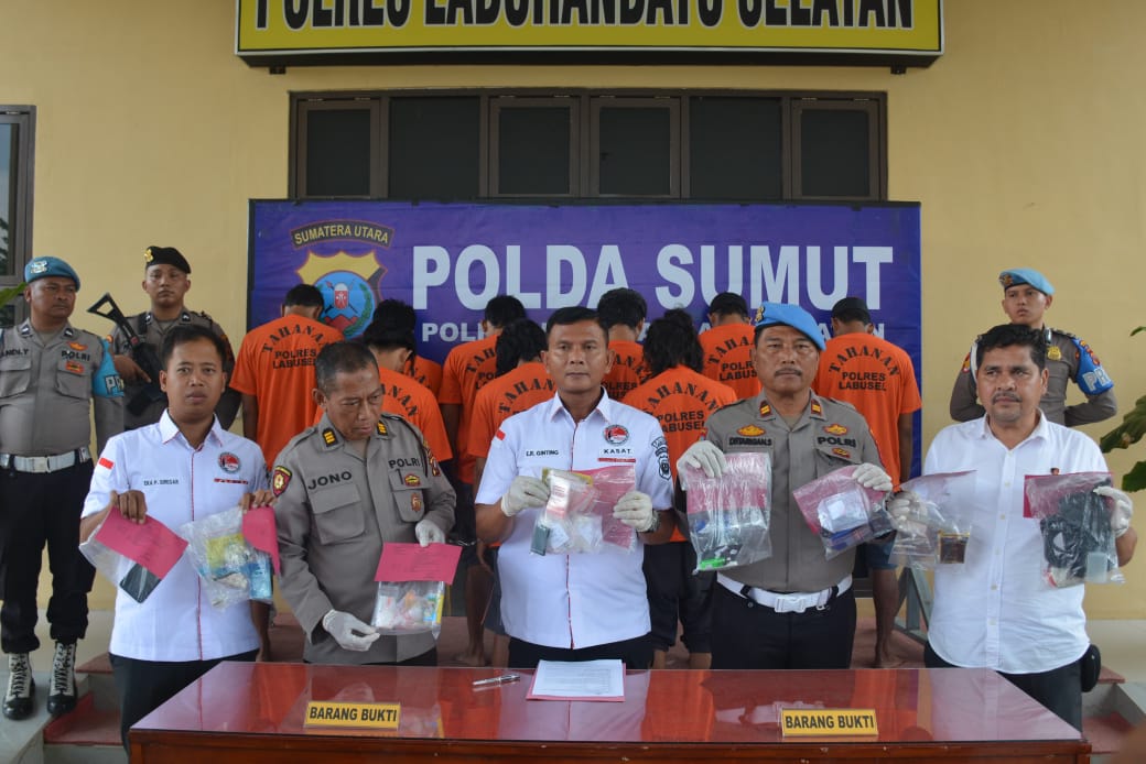 TOPIKSERU.COM, LABUSEL – Satuan Reserse Narkoba Polres Labuhan Batu Selatan (Labusel) meringkus sembilan tersangka narkotika dalam dua pekan operasi. Lima di antaranya adalah residivis.