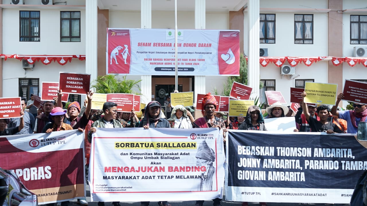 “Kami, Masyarakat Adat Ompu Umbak Siallagan di Dolok Parmonangan, mengajukan banding atas putusan majelis hakim PN Simalungun kepada Sorbatua Siallagan. Bebaskan Sorbatua Siallagan, tutup TPL,” seru masyarakat setelah surat permintaan banding dilayangkan di PN Simalungun.