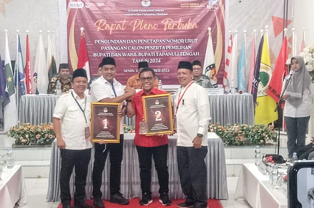 TOPIKSERU.COM, TAPANULI TENGAH – Dua pasangan calon Bupati dan Wakil Bupati Tapanuli Tengah, menyampaikan sambutannya usai melakukan pengundian dan penetapan nomor urut di kantor KPU Tapanuli Tengah, Senin (23/9) malam.