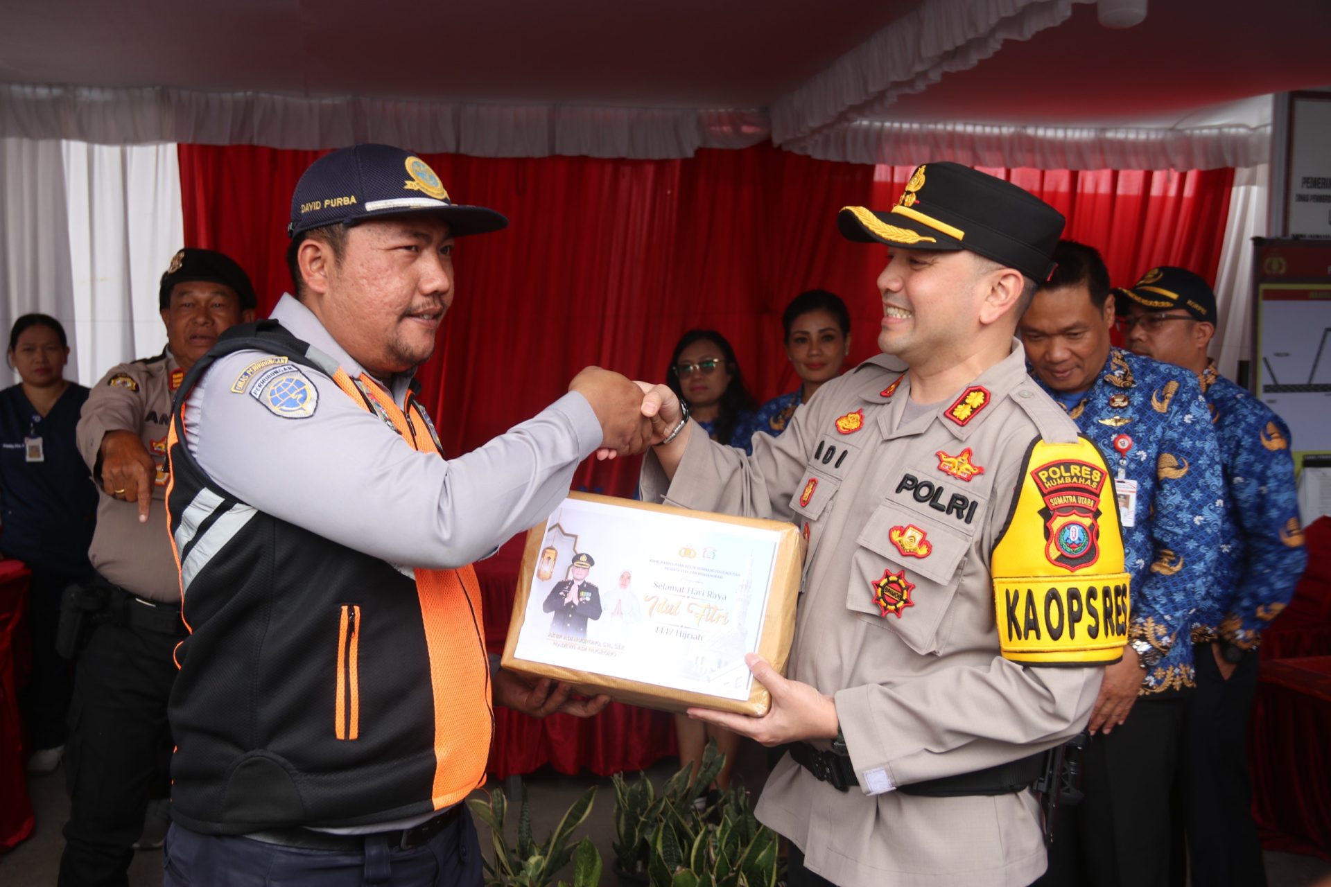 Kapolres Humbahas AKBP Adi Nugroho menyerahkan bingkisan pada petugas Pos Pengamanan Operasi Ketupat Toba 2026.(Foto: Humas Polres Humbang Hasundutan)