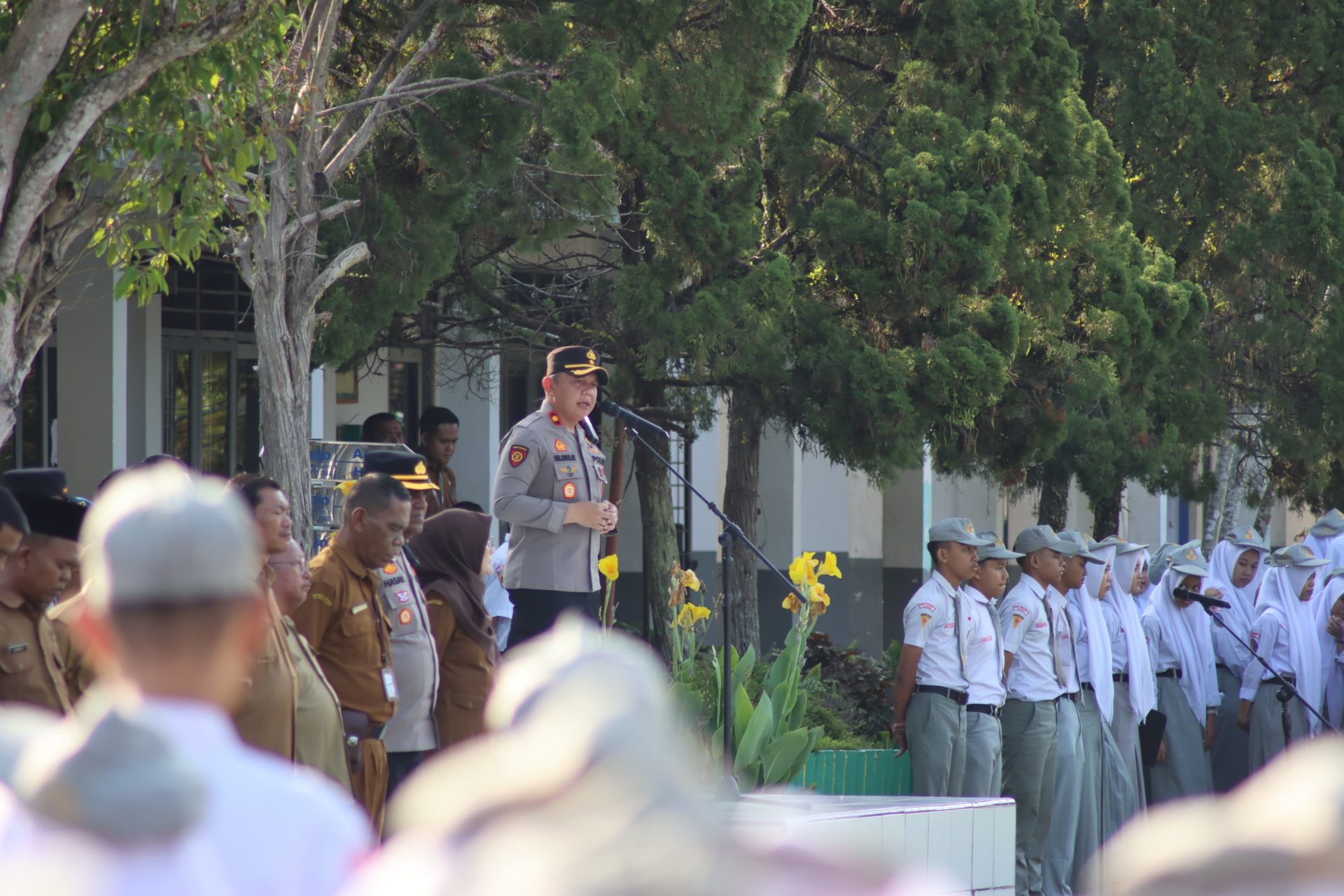 Kegiatan di lapangan sekolah turut didampingi para Pejabat Utama (PJU) Polres Langkat serta dihadiri oleh Kepala Sekolah, dewan guru, tenaga kependidikan, dan seluruh siswa sebagai peserta upacara.